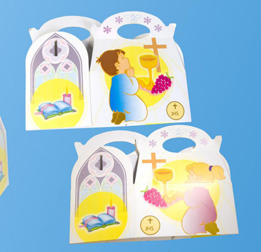 Pack of 15 communion boxes with details with a drawing of a girl and a boy. Measurements: 16cm x 10.5cm. The unit price of the product is € 0.20.
