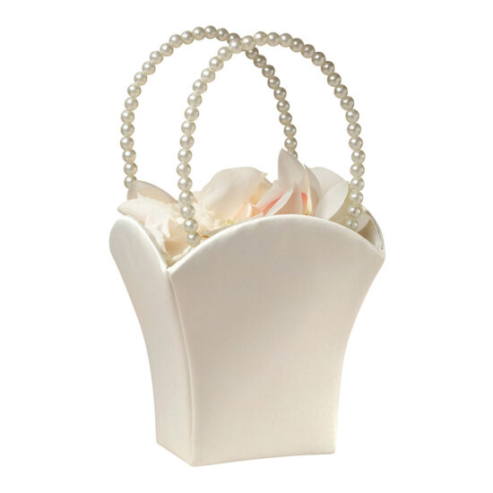 Hecha de satén en color crema y elegante asa de perlas