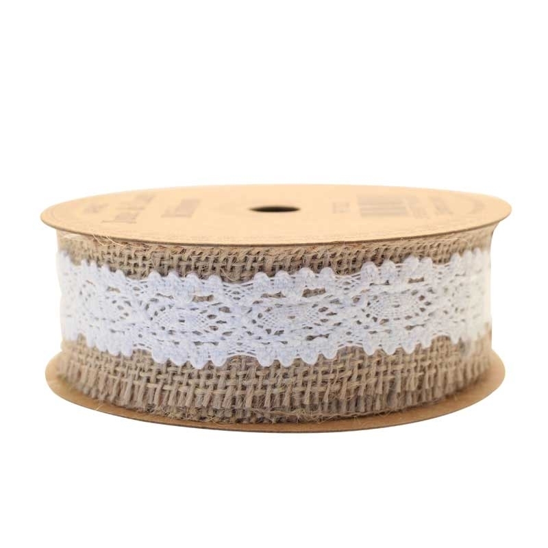 Cinta de jute decorada con puntilla de color blanco. Ideal para bodas con estilo rústico.