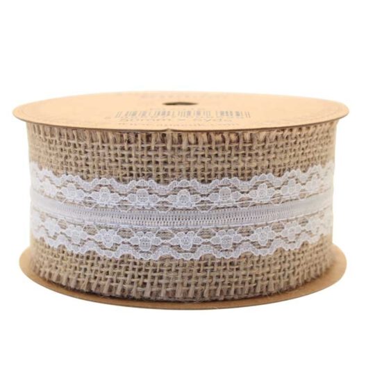 Cinta o lazo de arpillera decorada con encaje. Ideal para bodas con estilo rústico.