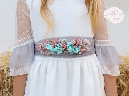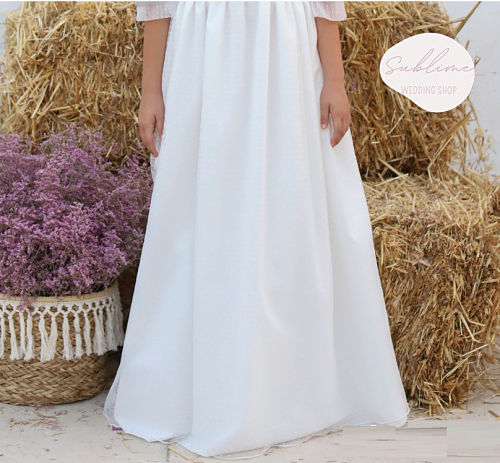 The full communion dress has a tulle top layer with embroidered polka dots, giving a boho and elegant touch to the communion dress.