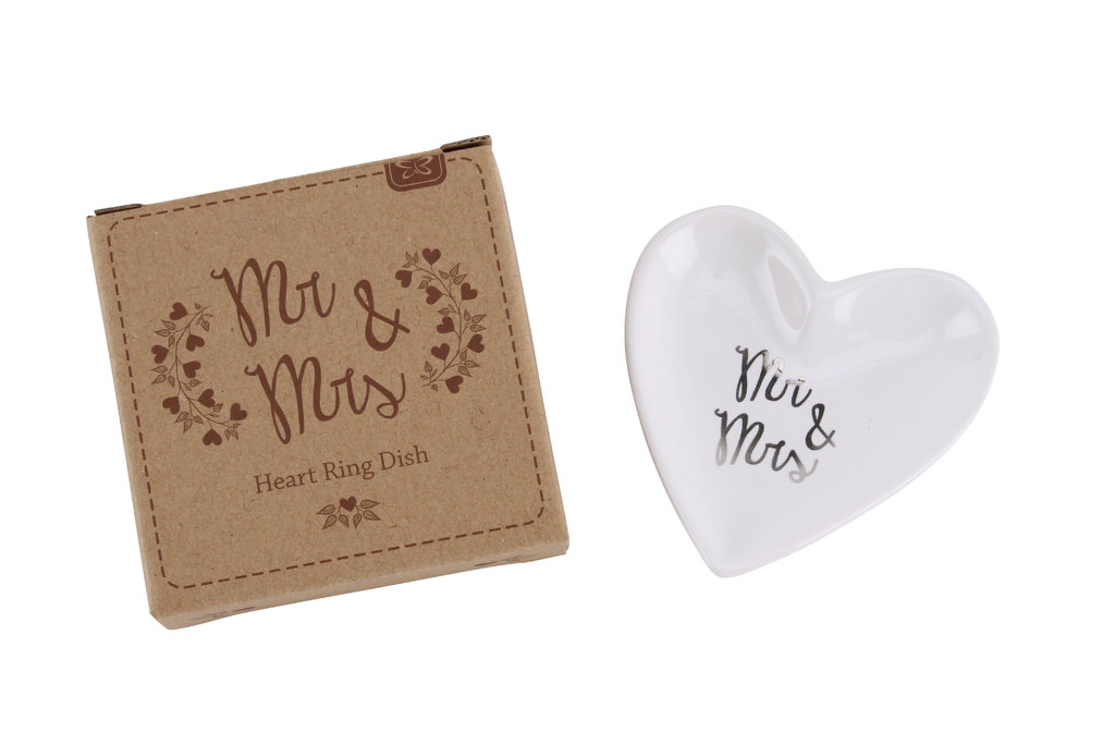 Corazón hecho de cerámica y decorado con texto «Mr & Mrs». Ideal para llevar los anillos o bien para regalárselo a los invitados que se van a casar próximamente