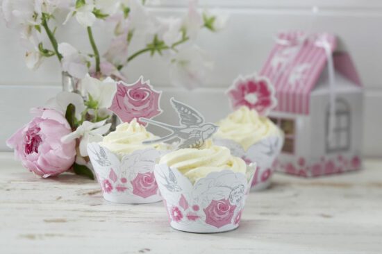 Dress your cupcakes up to look dainty and delicious with our Enchanted Rose Cupcake toppers and wraps. Elegant rose covered cupcake wraps with curly edges which stand up above the cupcakes and toppers in the shape of roses and swallows.