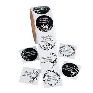 Rollo de 100 etiquetas redondas en Blanco y Negro con mensaje “Thank you for sharing our special day!” en cada etiqueta