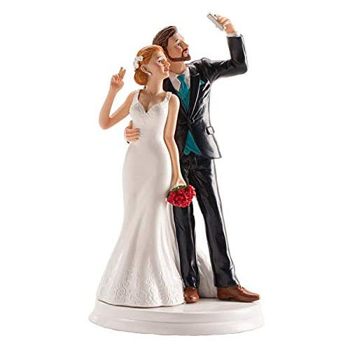 Figura de tarta muñecos de novios haciéndose un selfie.