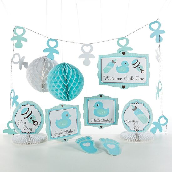 Kit de decoración ideal tanto para fiestas baby shower como para bautizos de niño en color azul y blanco