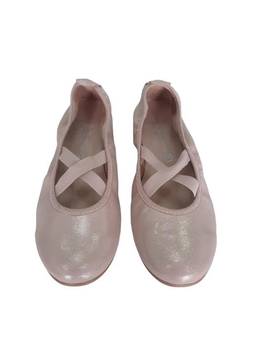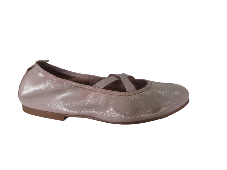 Soft leather Girl Ballet flat shoes dancer style with elastic crossed bands in Pink/gold colour.