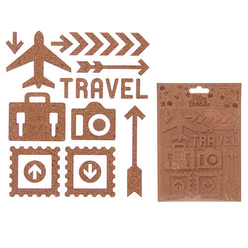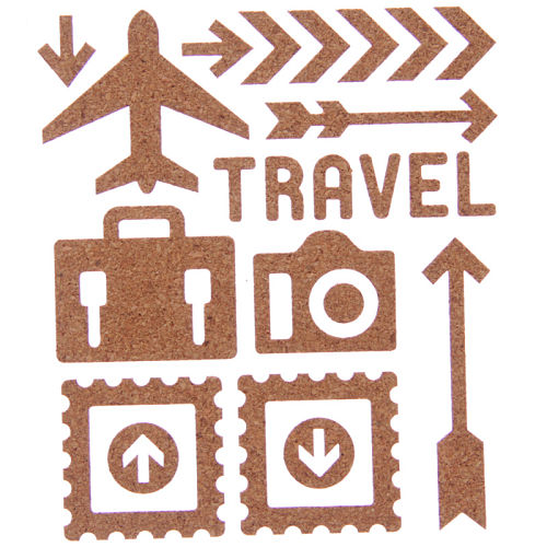 Pack de 15 pegatinas de corcho con motivos de viaje con diseños variados.