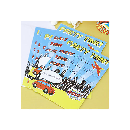 Pack of 10 pop art invitations for themed party.