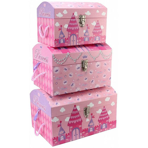 Set de 3 baúles de almacenamiento de castillo de princesas en color rosa.