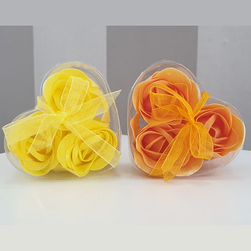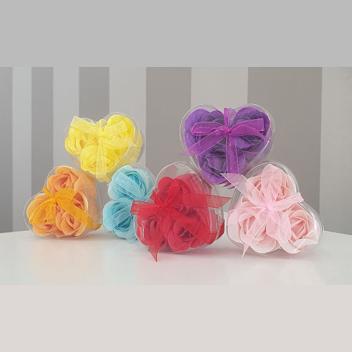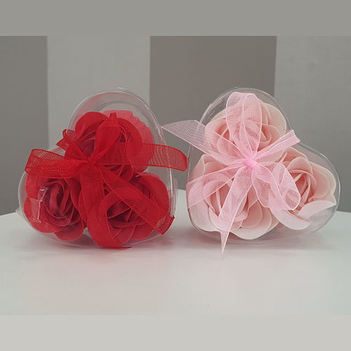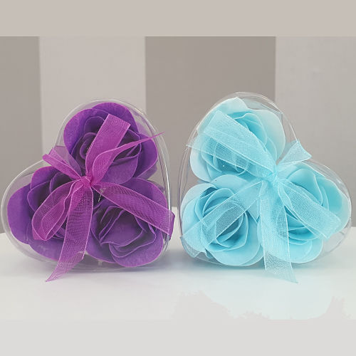 Three colored roses made from scented soap sheets. The three roses are flower-shaped soaps that come packed in a clear PVC box with a matching bow.