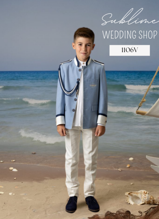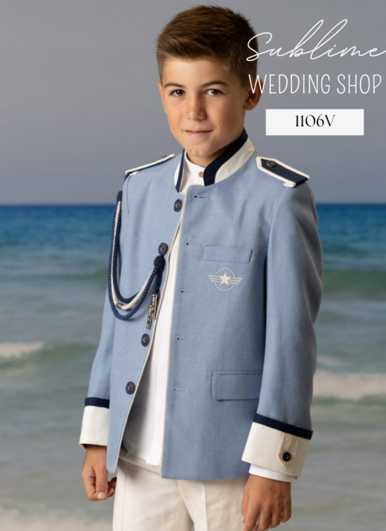 Traje de comunión de almirante para niño con cuello mao y compuesto por 3 piezas: chaqueta, camisa lino y pantalón slim ó recto con ajuste elástico para mayor comodidad