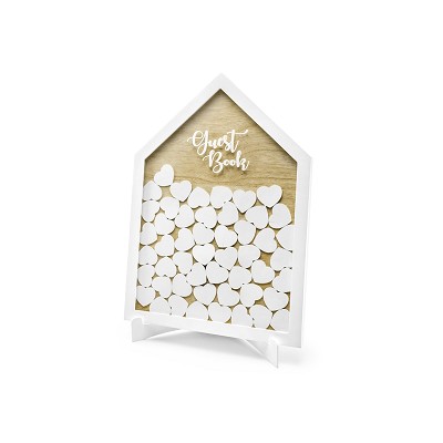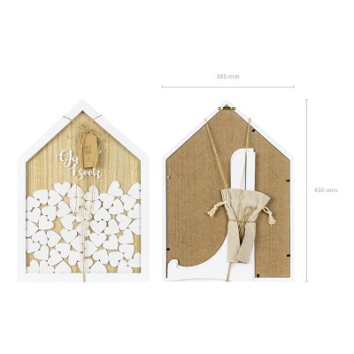 Wooden guest book with white inscription, set contains guest book in the shape of house and 50 white hearts to write in, size approx. 30.5 x 43 cm.
