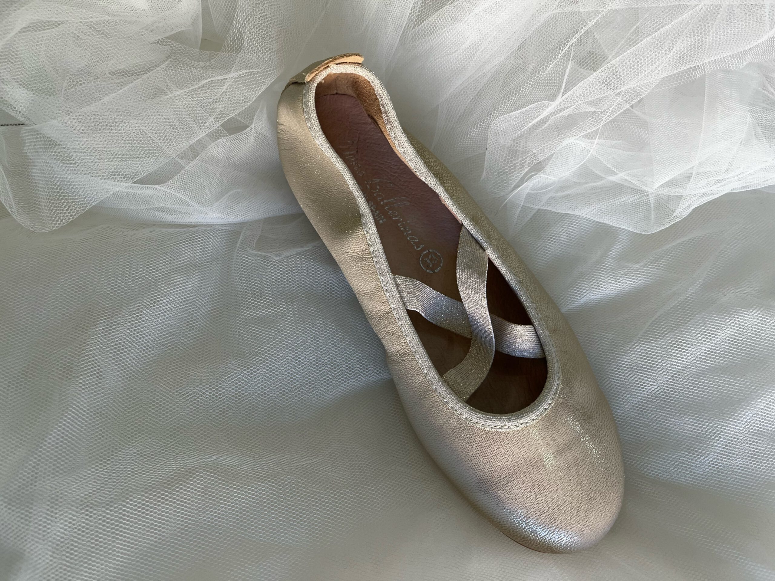 Bailarina niña tipo Ballet con cintas cruzadas elásticas en autentica piel muy suave en color parecido salmón con destellos dorados.