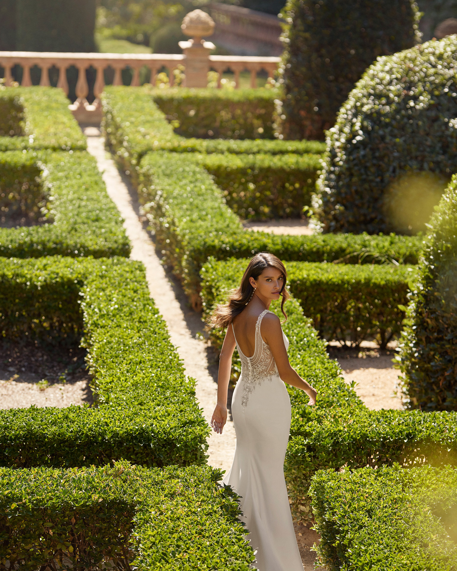 Romantic mermaid wedding dress crafted in crêpe and beadwork. Featuring a plunging neckline and beadwork back.