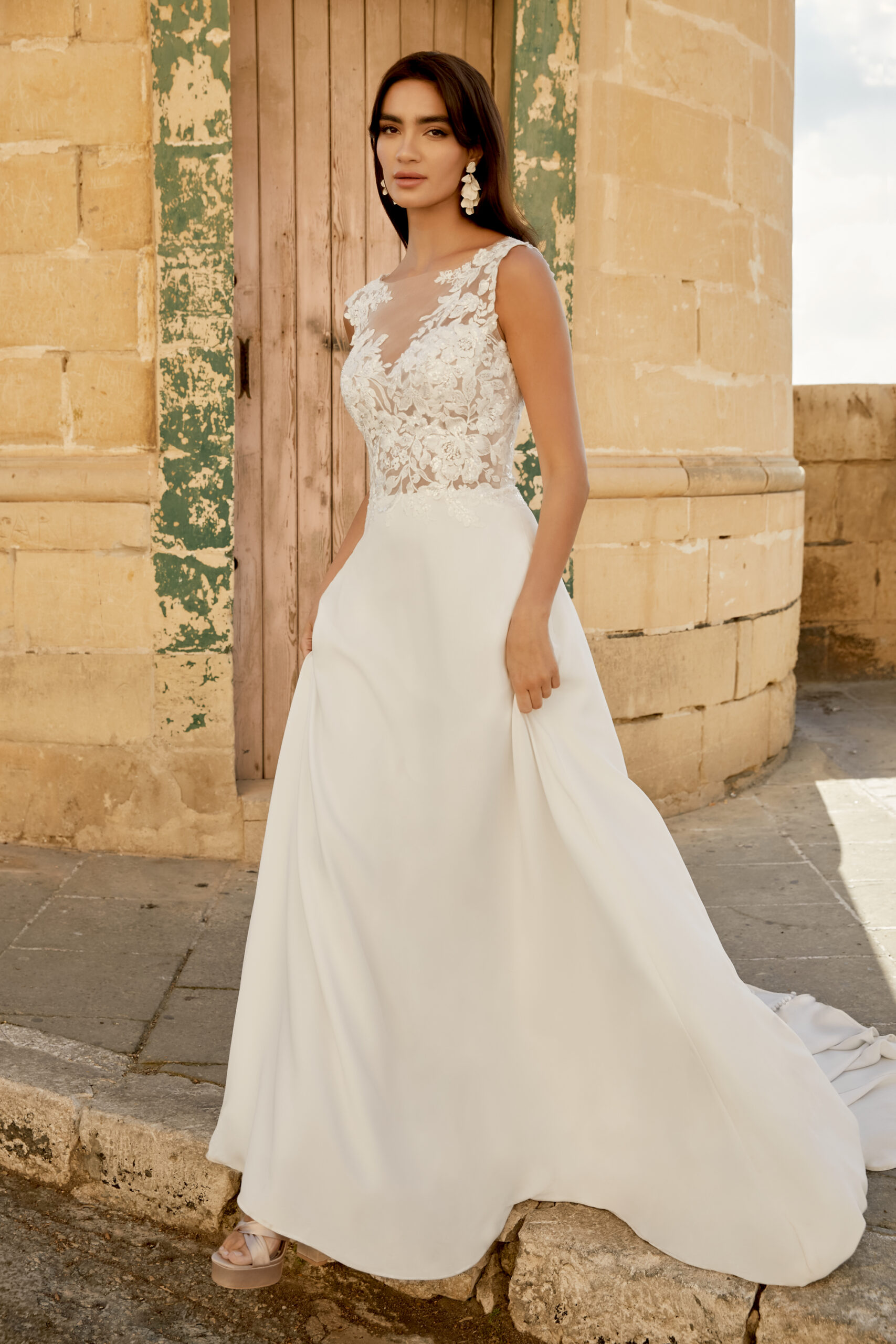 Crepe A-line with Illusion Sabrina with sweetheart neckline. Features sequin and beaded lace appliques including seed beads throughout sheer bodice trickling onto skirt waistline. Clean crepe skirt includes pockets. Finished with V-back with buttons to end of sweep train