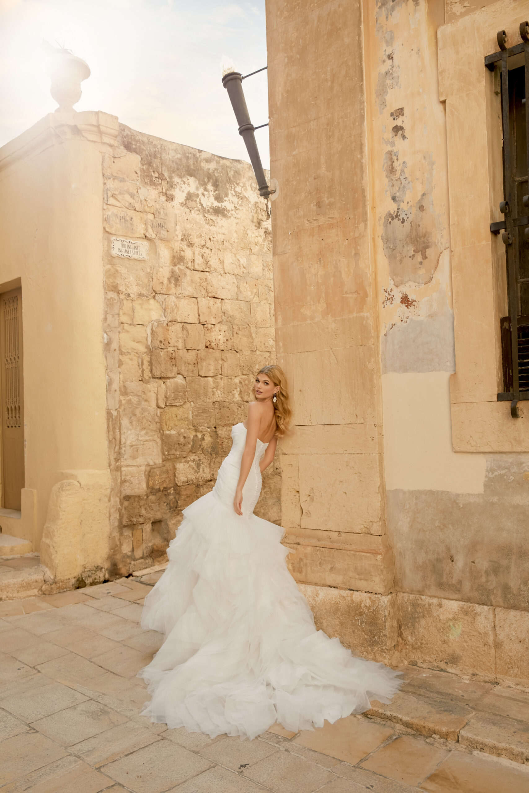 Organza trumpet gown with strapless straight neckline. Features ruched organza bodice with princess seams down the center. Complete with tiered ruffles in the skirt. Finished with buttons to top of skirt that trails into chapel length train