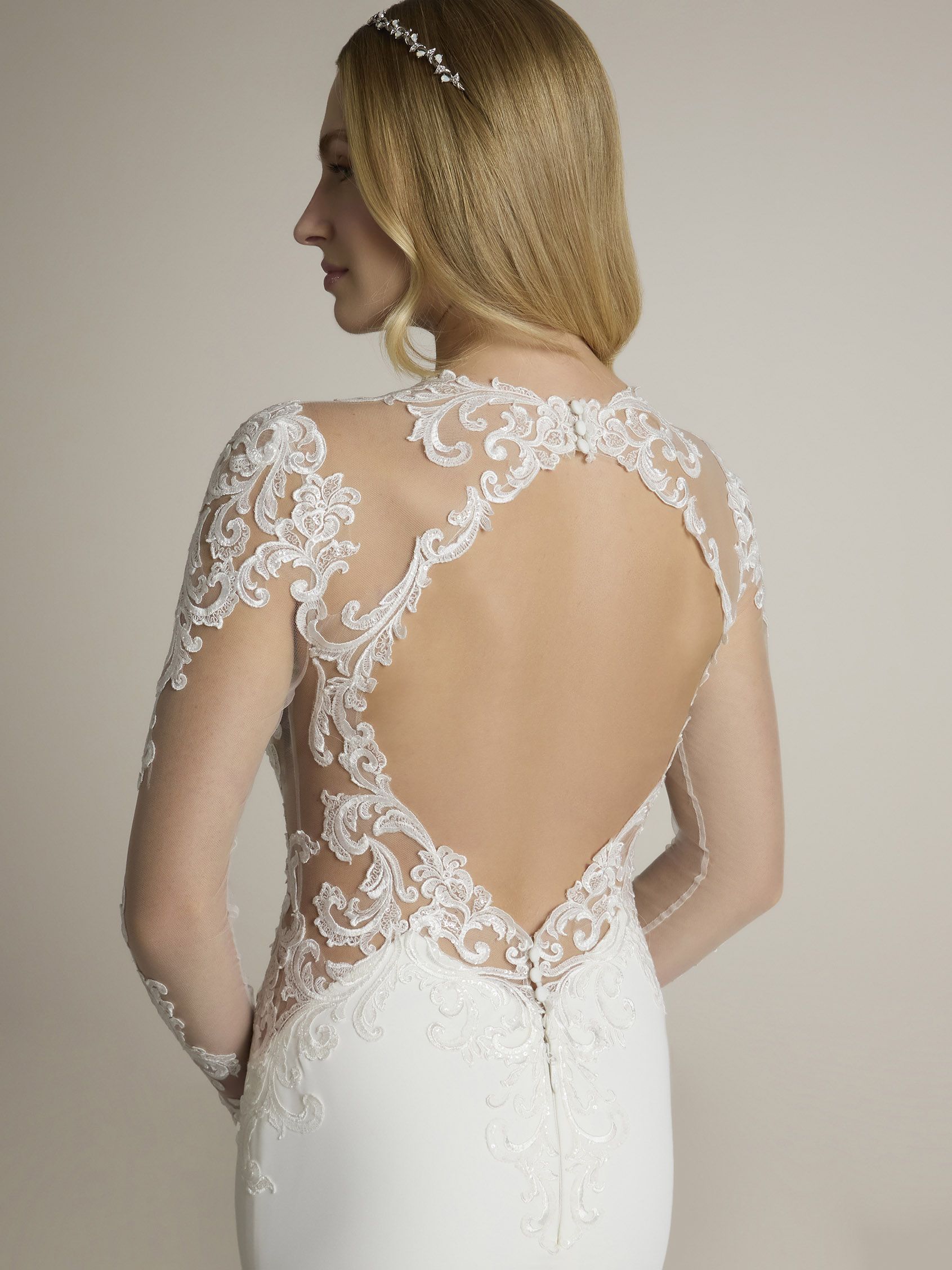 The elegance of the fit & flare cut and crepe is the key to the success of this model, which stands out for its elegant lace and bead embroidery on sheer long sleeves. It features a beautiful open back.