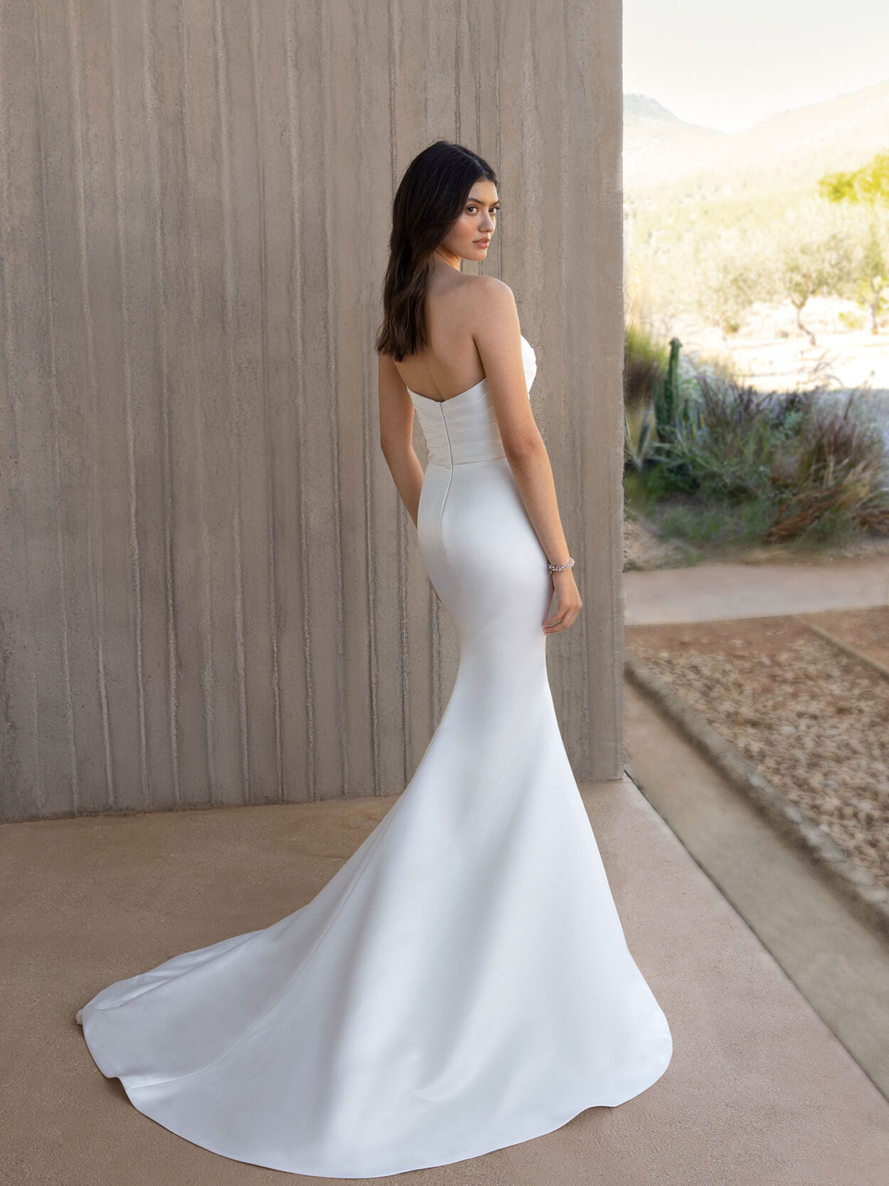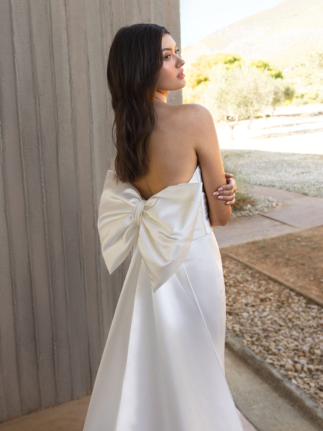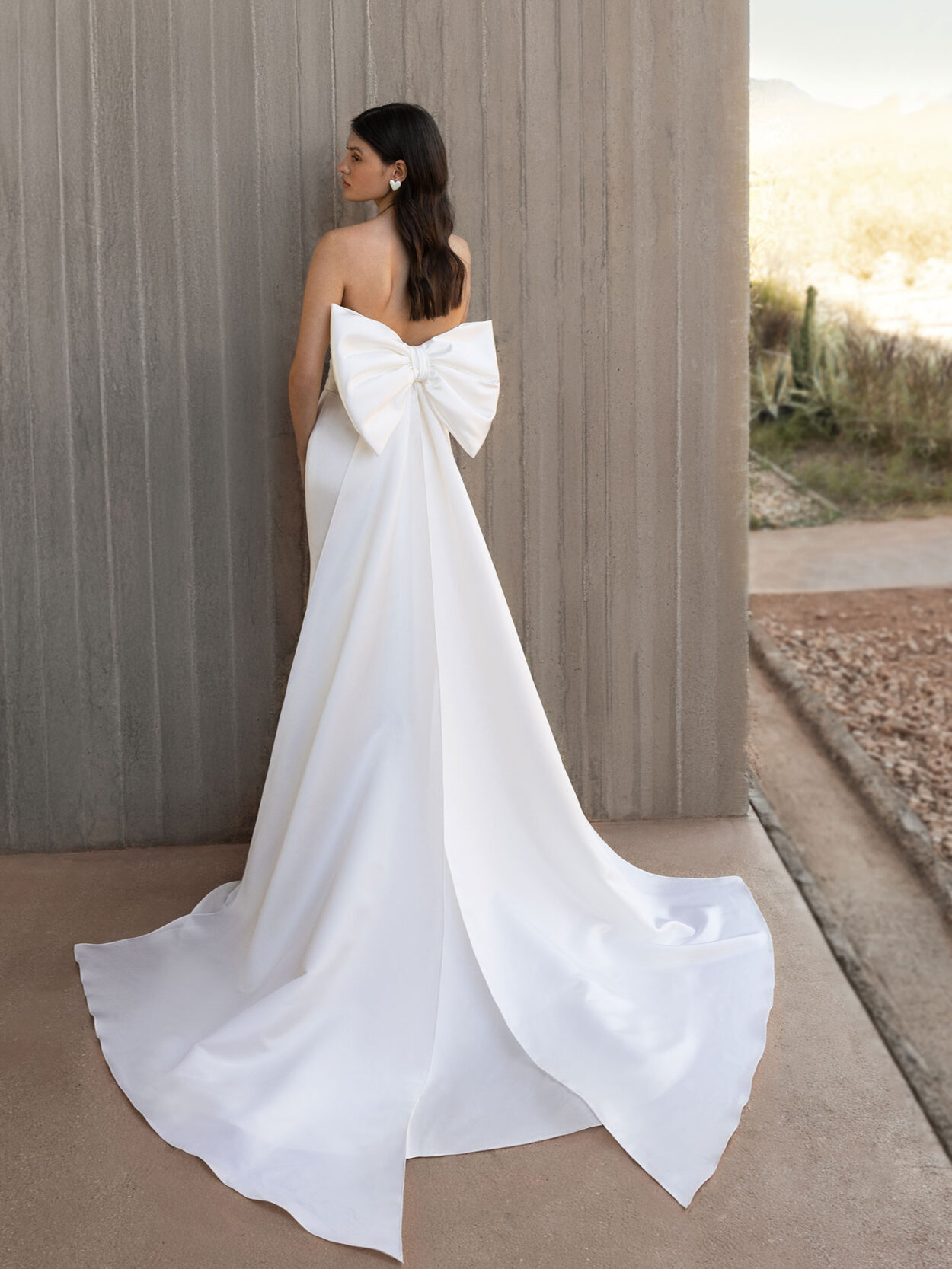 Refinado y elegante modelo con corpiño drapeado y un suave escote en forma de corazón que favorece la figura con una gracia atemporal. Combínalo con el lazo desmontable a juego ( vendido por separado) para un toque de sofisticación.