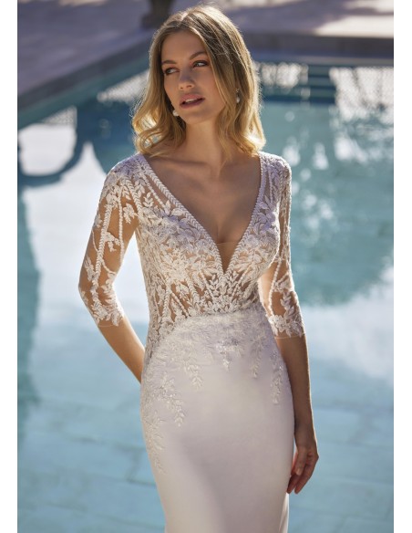 Mermaid wedding dress with stretch crepe flows beautifully into a fit and flare skirt, lace bodice, deep neckline, beading.