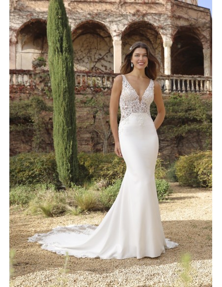 BRAND Ladybird/Pronovias COLOUR Ivory SILHOUETTE Mermaid NECKLINE V neckline FABRIC Crepe, beading and lace TRAIN LENGHT Chapel